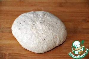 К полученной смеси добавляем муку (оба вида), туда же добавляем семена льна, соль и замешиваем тесто. Накрываем полотенцем и оставляем на 1,5 часа в тёплом месте до увеличения объёма вдвое.