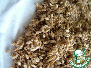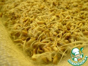 Вымоченное зерно высыпаем тонким слоем на влажную ткань и накрываем также мокрой тряпочкой. Зерно нужно поставить в нежаркое проветриваемое место на 2 суток. Периодически увлажнять из распылителя или подливать немного холодной водички.
