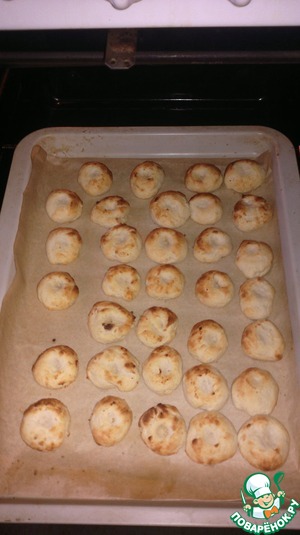 Дальше - кому как позволит фантазия с формой печенек! Тесто не нужно раскатывать, если хочется более крутое тесто, этот рецепт не подойдёт. Я просто черпала чайной ложкой и выкладывала на противень! Ну, а сегодня решила "выпендриться" :), черпала ложкой, скатывала шарик и прижимала пальчиком к противню, в серединке получалась ямочка. -