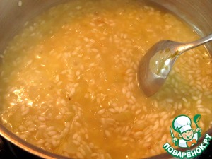 Дальше понемногу вливаем бульон. Как только очередная порция бульона впиталась, добавляем следующую, при этом все время помешивая рис.