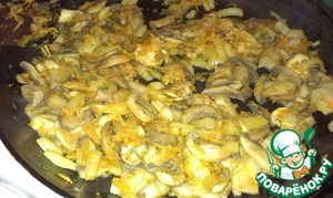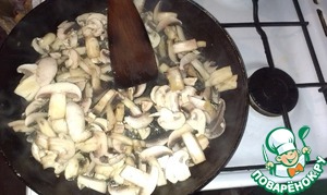 Духовку разогреваем до 180 градусов. Грибы промываем, режем, кому как нравится ( я резала пластинками ), выложим на сковородку и чуточку прожарим.