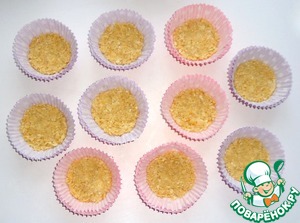 Для приготовления мини-чизкейков понадобятся бумажные формочки. Чтобы формочки держали форму, нужно сделать их двойными. В каждую формочку выложить немного измельчённого печенья со сливочным маслом и утрамбовать.
