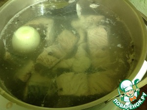 Ставим воду кипятить, добавляем соль, перец горошком, лавровый лист, очищенный целый лук.