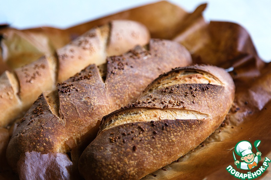А теперь символ Парижа (по версии французов) - багет! Встречайте!!! Сегодня у нас можно купить багеты почти в любом супермаркете. Но почему подчас корочка таких багетов вовсе не хрустящая, мякиш – белый, безвкусный, однородный и быстро высыхает. Всё дело в фабричной технологии, которая подразумевает приготовление хлеба как можно быстрее. А ведь настоящий французский багет, как мы знаем, это хрустящая ароматная корка и крупнодырчатый мякиш. Этого можно добиться только специальной длительной технологией приготовления теста, а тесто, приготовленное на закваске вместо дрожжей, еще больше улучшает качество готового изделия. С благодарностью за рецепт Михаилу (crucide).