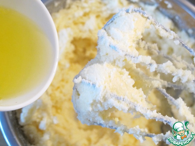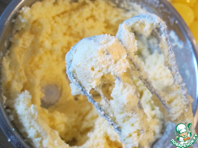 Масло (280 г.) с сахаром (2.1/4 ст.) взбить до пушистости.