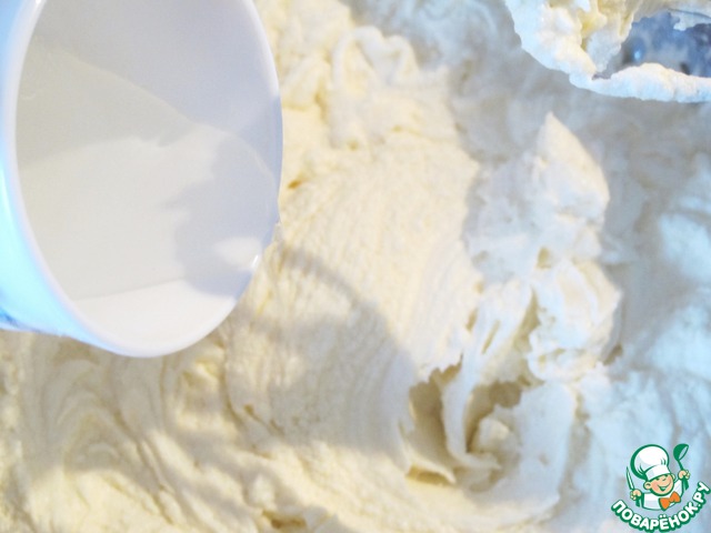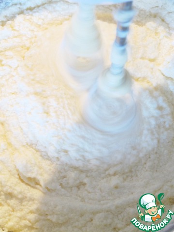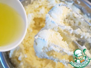 В масло с сахаром добавить 1/5 часть муки, перемешать с помощью миксера.