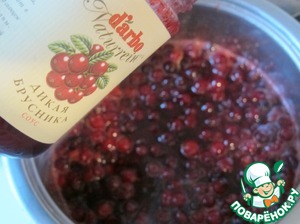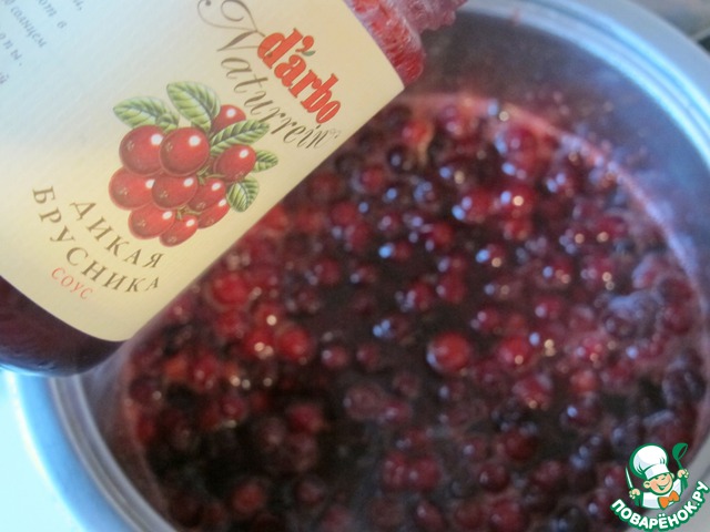 Также можно было использовать и один клюквенный соус, но у меня осталось по 150 граммов в каждой баночке. Клюквенного и брусничного соуса. Брусника только обогатила вкус. -