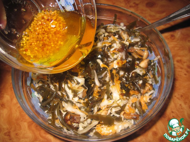 Рецепт «Салат из квашеной капусты, маринованных опят и морской капусты»: