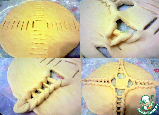 Берем оставшуюся часть теста и также раскатываем. Формируем рисунок. Думаю более понятно, как это делается, видно на фото.