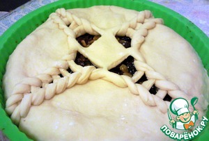 Укладываем подготовленное тесто на начинку и закрепляем по периметру. Смазывать перед выпечкой тесто не нужно.