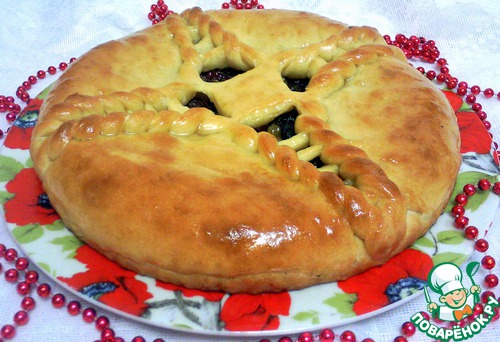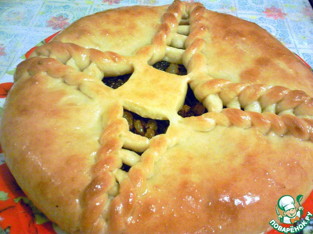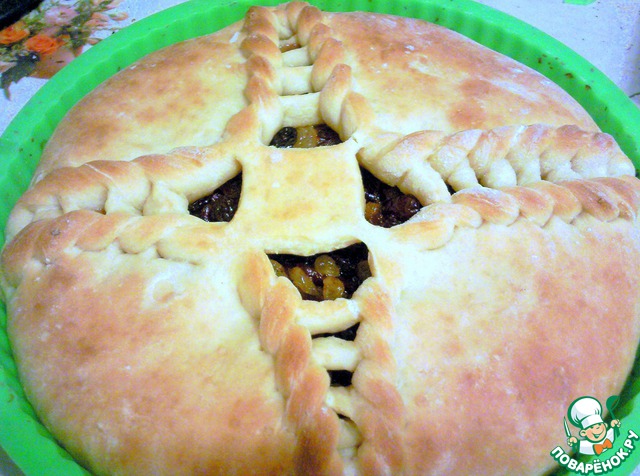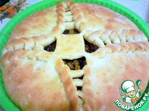 Для более праздничного и глянцевого вида поверхность пирога еще в горячем виде можно смазать сахарным сиропом (3 ст. л. сахара и 6 ст. л. воды довести до кипения).