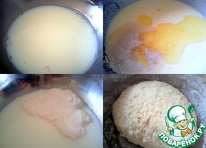Начнем с самого теста. Сгущенное молоко (примерно четверть стандартной банки) развести кипятком, хорошо размешать, молоко должно полностью раствориться. Добавляем натуральный йогурт. У меня был домашний на топленном молоке и с жирностью 4%, но спокойно можно взять магазинный с меньшей жирностью. В компанию к молоку с йогуртом отправляем растительное масло без запаха, дрожжи, сахар, соль и яйцо. Все перемешиваем, добавляем муку и замешиваем тесто. Оно получается немного липким, но добавлять лишней муки не стоит, иначе тесто будет "забитым".