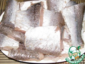Рыбу помыть, разделать на филе и порезать на порционные кусочки. Посолить и поперчить. У меня был кинг-клип, но, думаю, что подойдет и треска, тилапия, хек, минтай.