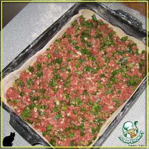 Колбасу проворачиваем через мясорубку, лук и укроп мелко режем. Перчим, если хотим острый пирожок "на закусочку". Тесто делим на 2 части, из 1 раскатываем низ пирога, выкладываем в форму, делаем бортики. Начинку распределяем ровненько. -