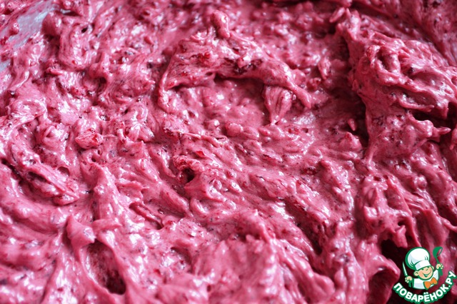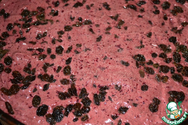 Тесто выложить в смазанную форму, сверху насыпать изюм или ягоды, чуть притопить. Выпекать в разогретой духовке до 180 градусов 40 минут.