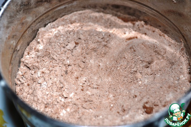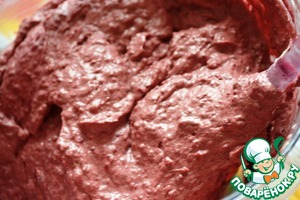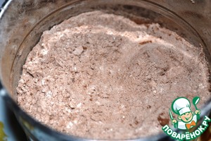 Добавить просеянную муку с разрыхлителем и какао. Перемешать.