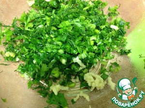 Ставим кипятить воду, сами начинаем тем временем мелко шинковать зелень, чеснок пропускаем через пресс.