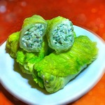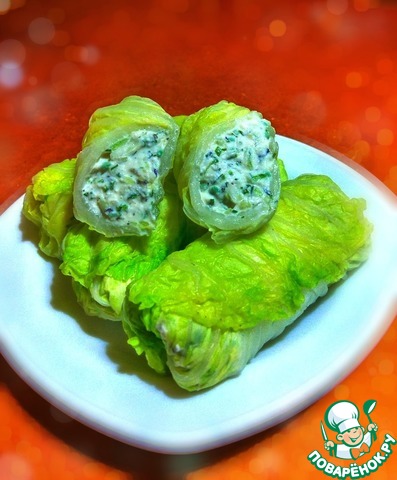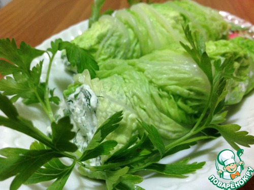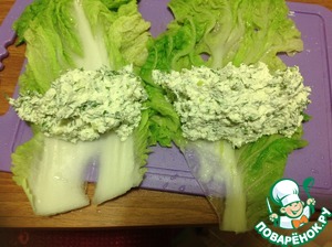 Ждем, когда листья остынут, отрезаем белую подножку, оставляя только зелень листьев. В центр листа щедро кладем творожную начинку
