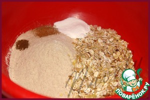 Смешиваем в большой миске сухие ингредиенты: просеянную полбяную муку, хлопья, разрыхлитель, корицу, гвоздику, перемешиваем. -