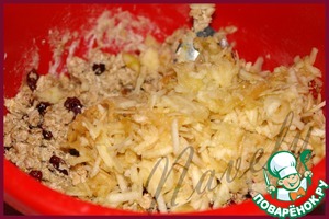 Далее добавляем натертые на крупной терке яблоки. Как следует все вымешиваем, тесто получается довольно-таки крутое, это не страшно.