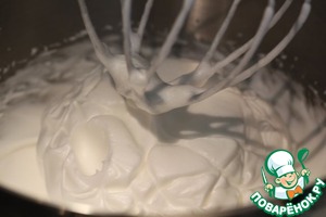 Белки смешиваем с сахаром в чаше миксера. Ставим чашу на водяную баню и, все время помешивая, держим до полного растворения сахара. Белковая масса должна стать теплой. Включаем миксер и взбиваем на средней скорости до блестящих и мягких пиков.