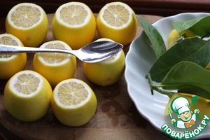 У лимонов срезаем шляпки с обеих сторон. Красивую часть шапочки оставить для украшения. Далее нам понадобится ложка с острыми краями, либо если у вас есть ложка для цитрусовых, как у меня, это быстро ускорит дальнейшее действие.