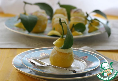 Подавать немедленно, присыпав сахарной пудрой и украсив верхушкой лимонной шапочки.