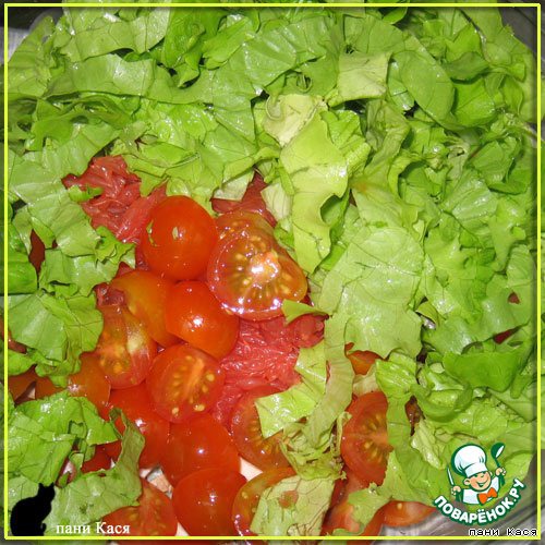 Салат нарезали, черри - пополам (попки я всегда вырезаю, кто-то режет так).