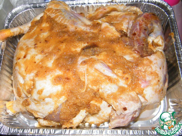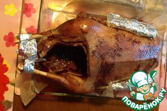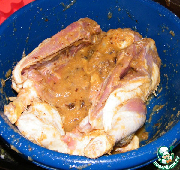 Утку промыть и обмазать получившемся соусом, оставить так мариноваться минимум час (можно и сутки), у меня стояла ночь.