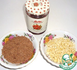 Для начинки пирога понадобится шоколад, миндаль (можно взять любые орехи по вкусу) и клюквенный соус ТМ "D'arbo". Миндаль залить кипятком и оставить на 20 минут, затем очистить от кожицы и мелко нарезать, шоколад потереть на средней тёрке.