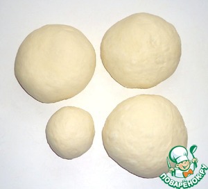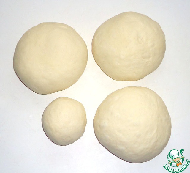 Тесто разделить на 4 части: 3 одинаковых и 1 маленькую. Маленькая часть теста понадобится для украшения пирога.