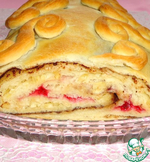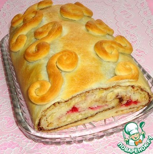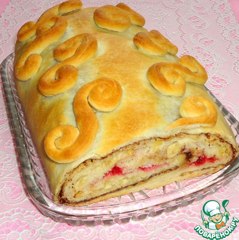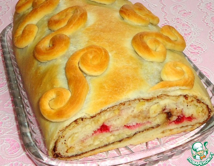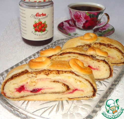 Очень вкусный пирог из дрожжевого теста в виде рулета с тремя начинками - шоколад, миндаль, клюквенный соус ТМ "D'arbo".