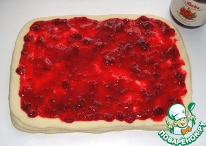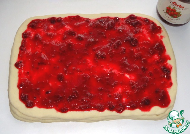 Раскатать третью часть теста в пласт по размеру, как первый и второй, положить на второй пласт с миндалём и равномерно выложить клюквенный соус или джем.