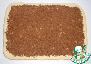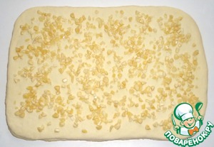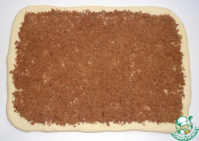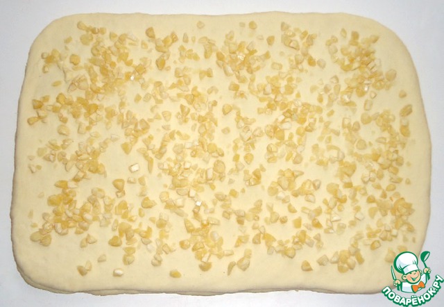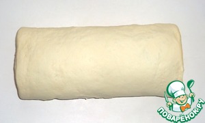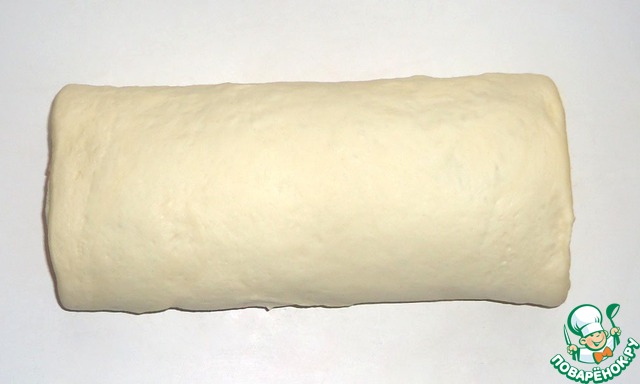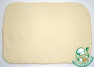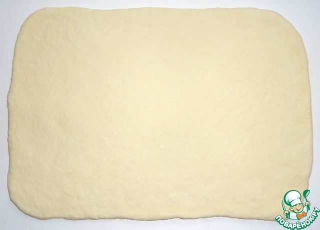 Тесто раскатать в прямоугольный пласт толщиной ~ 0,5 см.