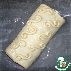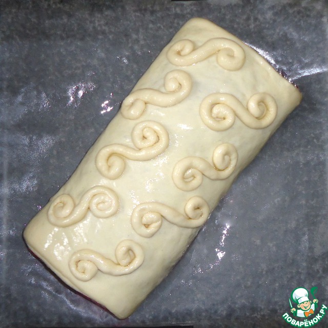 Противень застелить бумагой для выпекания, смазанной растительным маслом, выложить рулет и украсить жгутиками, заготовку пирога смазать растительным маслом. Выпекать в духовке, разогретой до 180-190 градусов 20-25 минут.