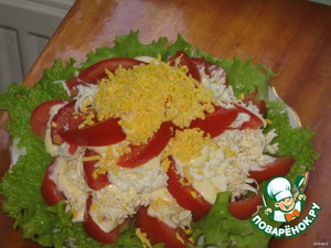 Выкладываем тертый сыр, опять - майонез с чесночком. Салат делать в виде конуса, каждый слой - немного меньше по диаметру.