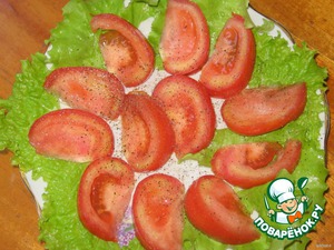 На блюдо выкладываем листья салата, потом - помидоры, нарезнные ломтиками, в один ряд кругом, солим, перчим. Смазываем смесью майонеза и давленого чеснока.