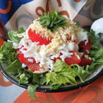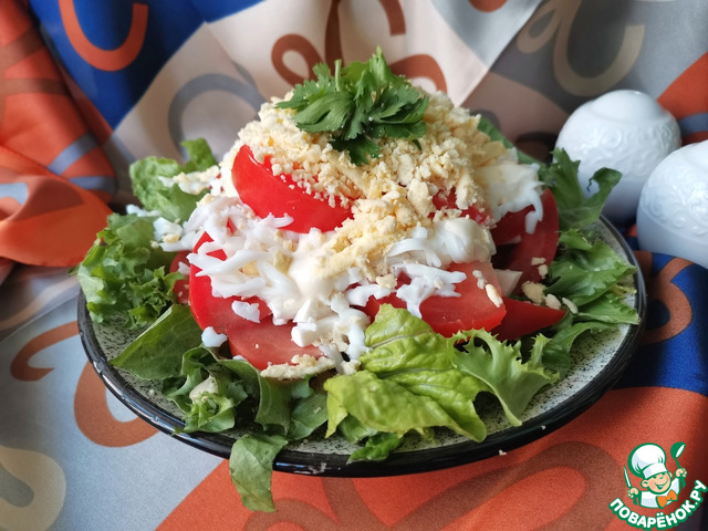 Последний слой - помидор, соль, перец, майонез и чеснок и делаем верхушечку из тертых желтков. Наша помидор-гора готова!!! Очень быстро, вкусно и красочно!!! Приятного аппетита!!