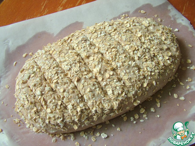 Вываливаем заготовку на пекарскую бумагу. Смазываем белком и обсыпаем овсяными хлопьями. |