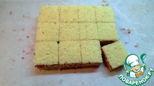 Даем бисквиту немного остыть, минут 5, не более. Снимаем с пергамента. Разрезаем на равные 4 части.