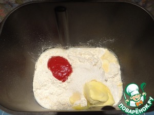 Добавляю в ведерко хебопечки просеянную муку, сахар, соль, томатную пасту, размягченное сливочное масло, половину чуть взбитого яйца.