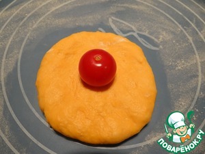 Беру один шар теста, чуть раскатываю его, на середину кладу один помидор черри.