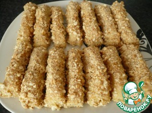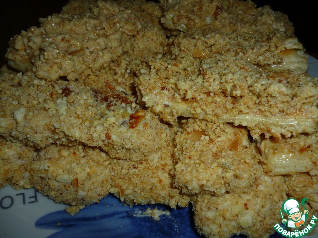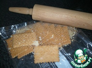 Размельчить орехи (можно взять мак, лесной орех, кокосовую стружку, кто что любит) и печенье с помощью скалки в полиэтиленовом пакете, но не в порошок!