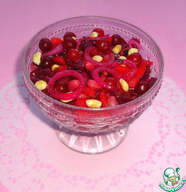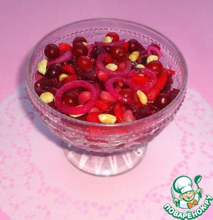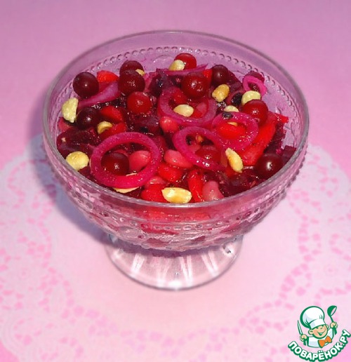 Я подавала салат в креманке, можно подать в салатнике. Салат выложить в креманку, добавить клюкву и очищенный арахис половинками или целый.