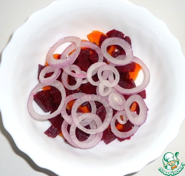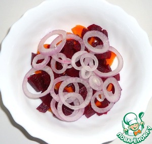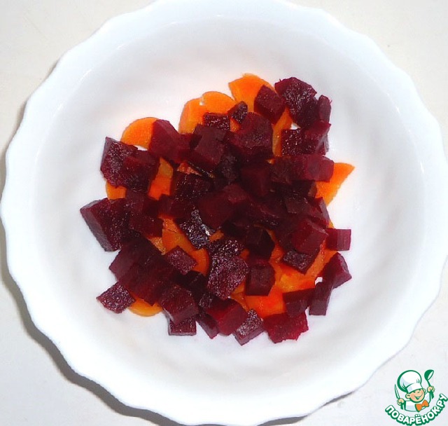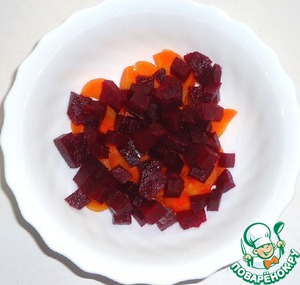 Вареную свеклу нарезать кубиками.