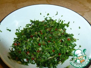 Измельчить зелень, чеснок, перец (можно на мясорубке или блендере) и немного посолить.