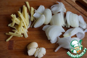 Луковицу и кусочек имбиря нарезаем, чеснок раздавливаем.