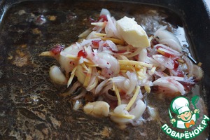 Складываем мясо утки в посуду, пересыпая луком, имбирем, чесноком.