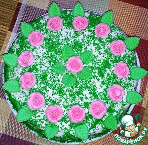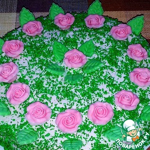 В списке ингредиентов не нашла украшения. Верх торта украсила розами (взбитая сахарная пудра с белком). Двух пачек мне не хватило, позаимствовала две розочки из третьей упаковки. В одной упаковке 6 штук. У меня ушло 14 роз, 13 по краям и 1 по центру.