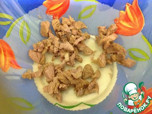 Остывшее мясо режем маленькими кубиками и выкладываем в посуду, где будем делать начинку.